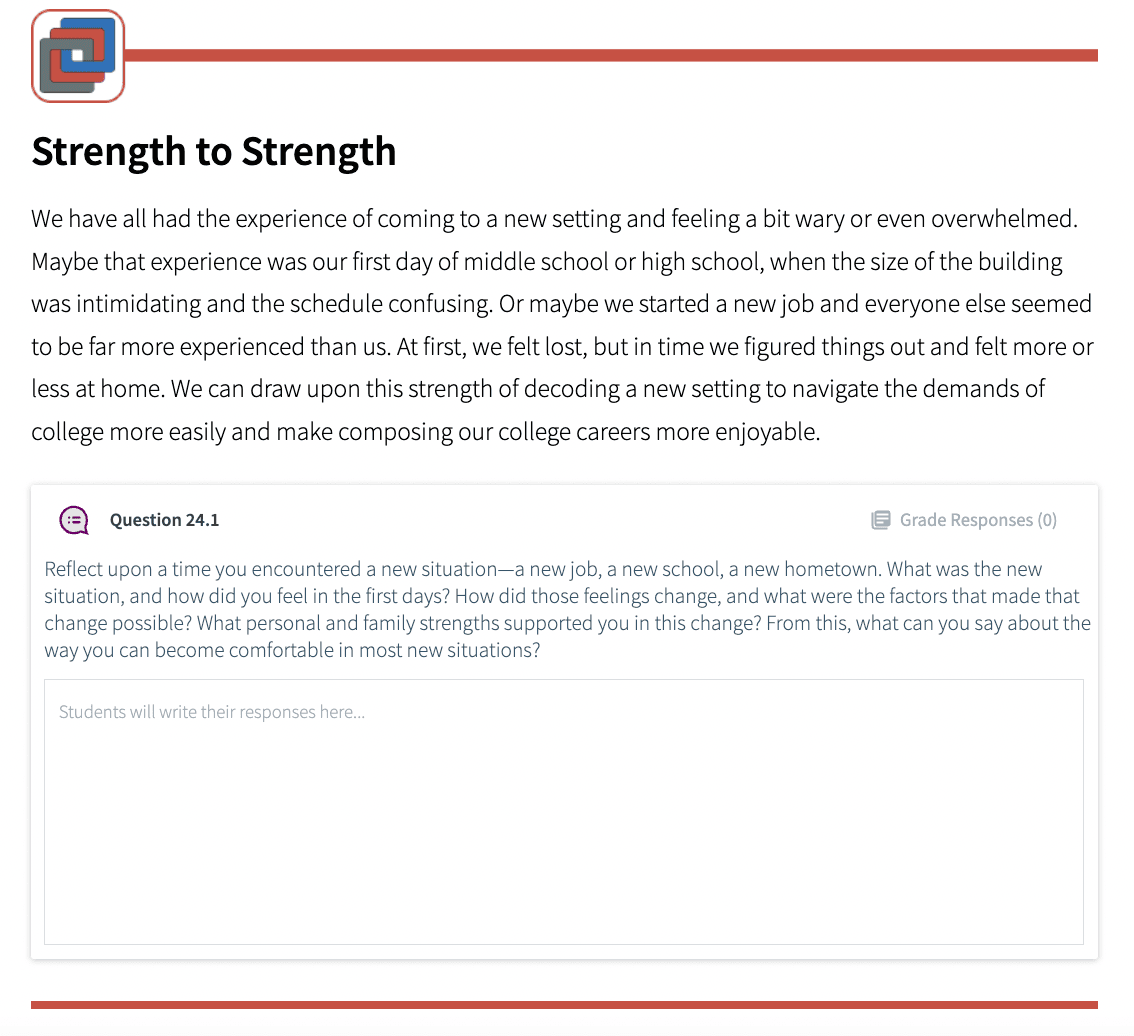 • Encourages a mindset for success and well-being through self-directed research and informal reflective writing, mimicking students’ real-world practices with college-level applications