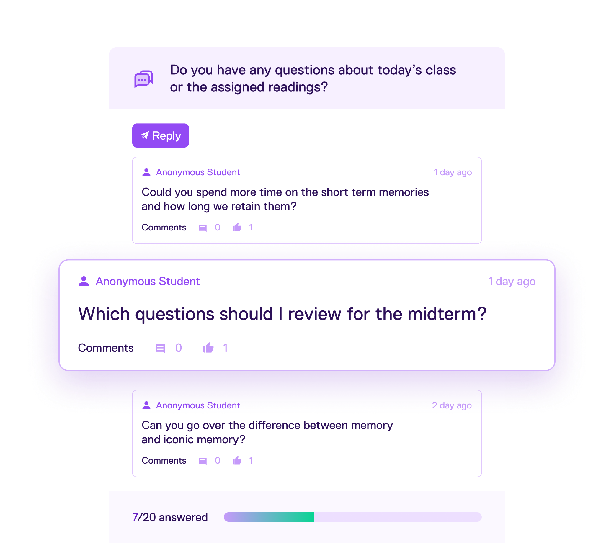 Yes. Instructors have the option to pose anonymous discussion questions to their class. They are a great tool when collecting sensitive, polarizing, or personal feedback from a class with privacy, accuracy, and honesty. When an anonymous question is selected, you will not be able to see what individuals answer. Only aggregated results will be available from our live polling software when an anonymous question is used, meaning it cannot be graded as students’ identities are hidden. Read more about anonymous questions in this Support article.