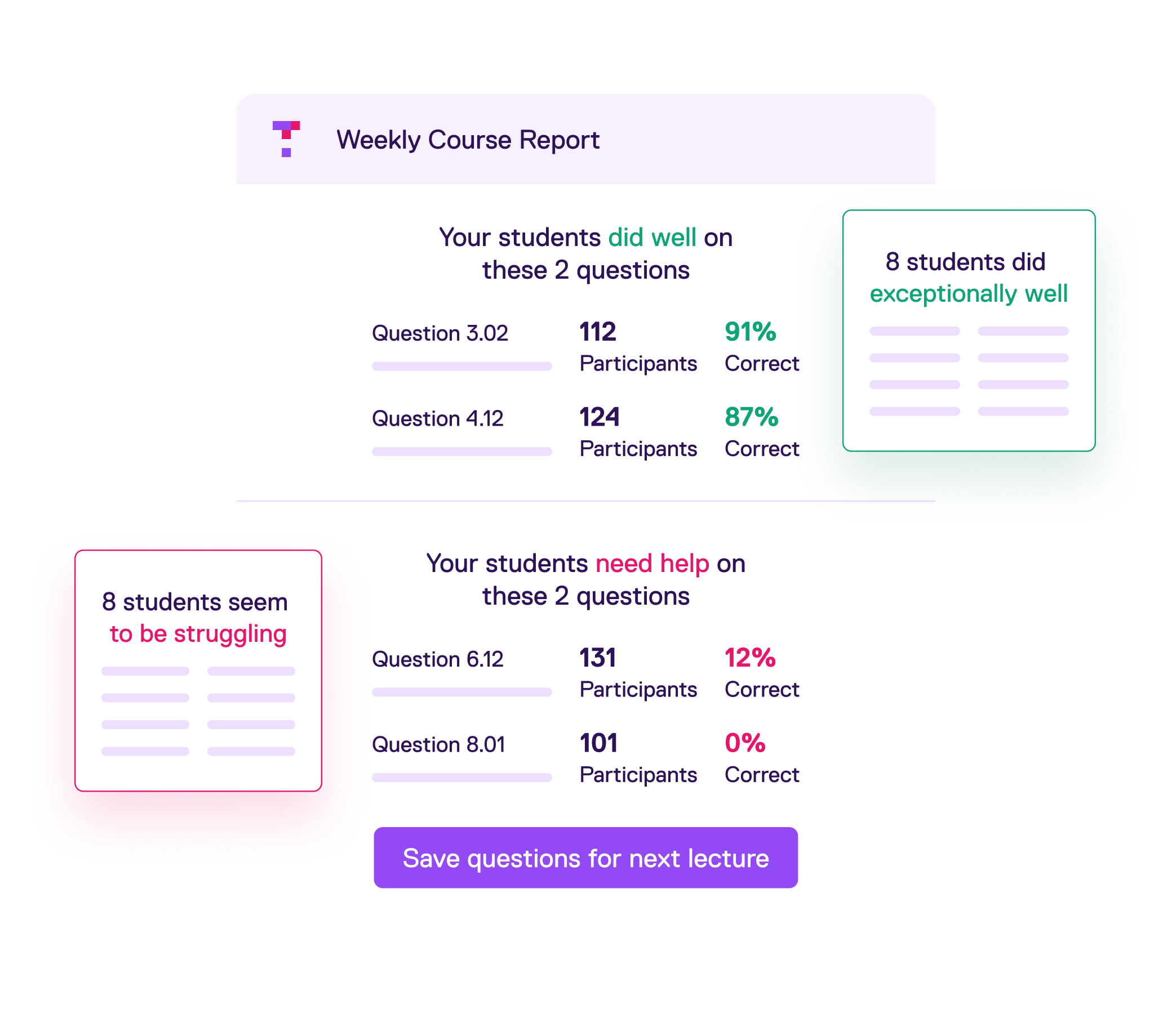 Essentially, real-time data and insights empowers educators to adapt their teaching on the fly to best help their students succeed. Top Hat collects learning insights from assessment, attendance, and participation data in real time, which allows educators to understand which parts of their courses are working and which students need extra help. Educators can use polls, quizzes, and discussions to gauge student comprehension, and adapt their course material as needed. With the Top Hat Gradebook, educators get a holistic view of participation and performance that shows class-wide trends while also helping to identify and support at-risk students.