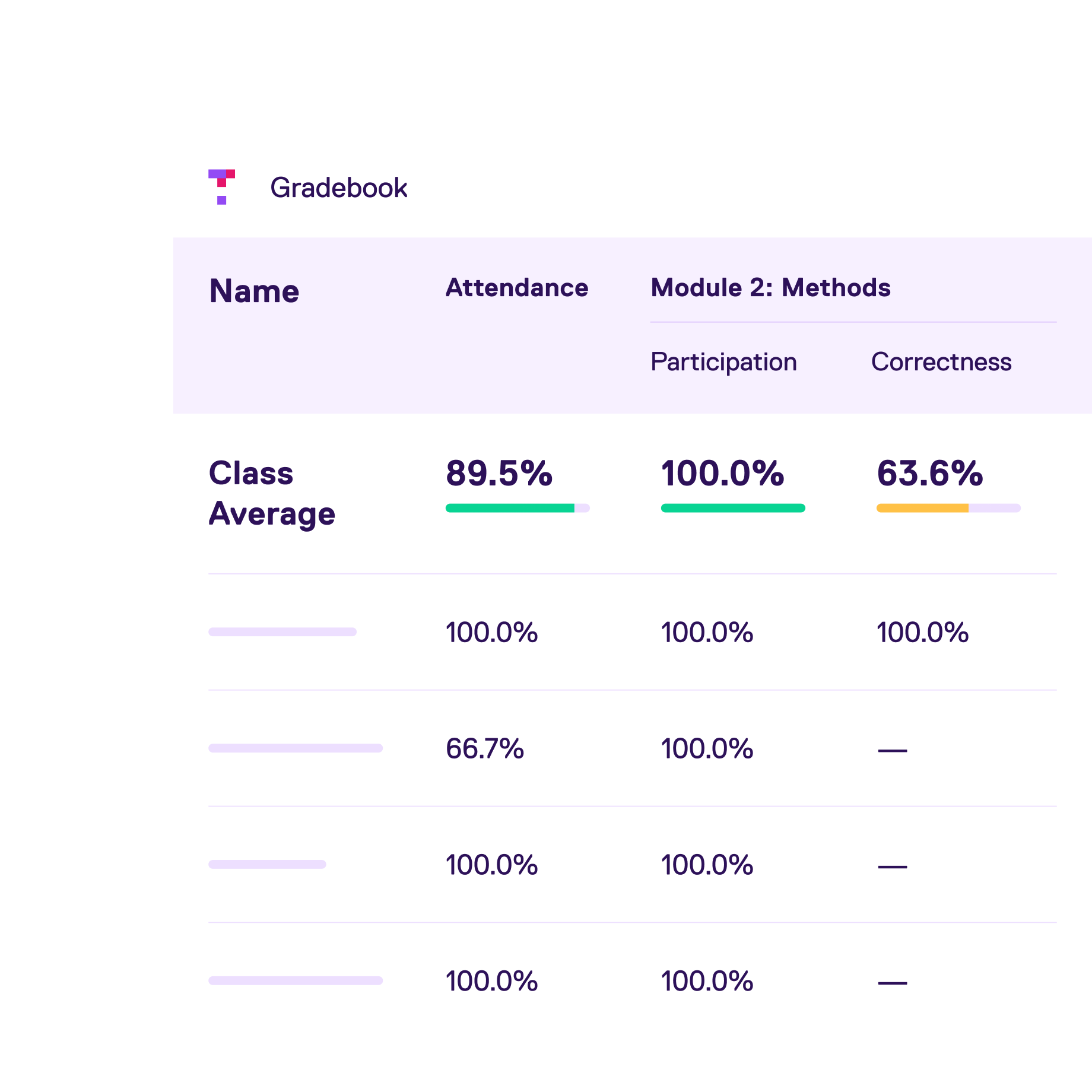 When you teach with Top Hat, you can use our platform software to track student progress in real time. Top Hat collects assessment, attendance, and participation data in real time, putting actionable learning insights at your fingertips. You can use the Top Hat Gradebook to get a view of your entire course and each student’s performance—attendance, participation, test and assignment results. Learn more about the Gradebook in this Support Center article.